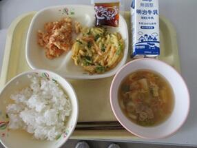 今日の給食は、阿久津中1年1組の献立で、わかめご飯、牛乳、鶏から揚げのレモンソース和え、もやしのナムル、豚汁です。高根沢町で生産されたものは、味噌、にんじん、ねぎ、米です。今日もたいへんおいしく頂きました。