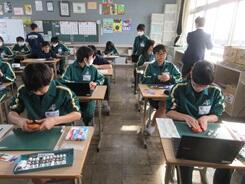 連体詞、副詞、接続詞、感動詞について、タブレットを使いクイズ形式で学習していました。