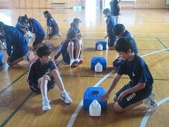 表現運動で、グー、チョキ、パーを体でどのように表現するかグループで考えていました。