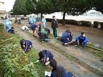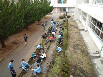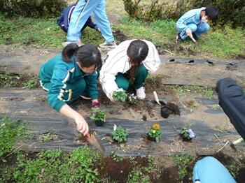 本日の放課後、生徒会常任委員会が実施されました。その中で、環境緑化委員会は、校舎前の花壇にパンジーや先日のチューリップ交流会でいただいた球根などの植え込みを行っていました。これから来る冬の寒さに耐え、美しい花を咲かせてほしいですね。