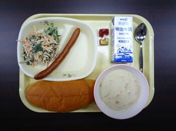 揚げパン トマトオムレツ 海藻サラダ 野菜とウインナーのスープ