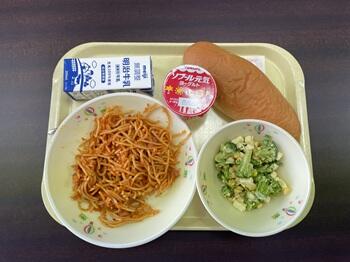 牛乳パン スパゲッティナポリタン ブロッコリーとチーズのサラダ ヨーグルト(ヤクルト)