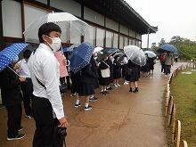 修学旅行記 12 二条城 投稿日時 : 2022/04/24 HP担当者 修学旅行最後の見学地、2・3・4・6組は「二条城」を見学しました。小雨にはなっていますが、まだ傘が必要です。「二条城」は大政奉還の場として有名で、社会科の教科書にも度々描かれています。実際に見学し、感動していたようです。見学後、京都駅に向かいます。各クラスごとに入場です お城の中を見学後、写真撮影これから庭園を見学です 庭園もすごくきれいに手入れされています。