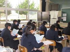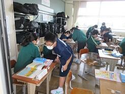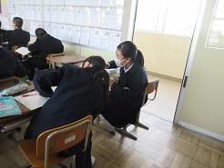 数学に取り組んでいるクラス、教科書を配布しているクラス、修学旅行の調べ学習に取り組んでいるクラスがありました。