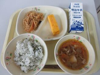 今日の給食は、わかめご飯、牛乳、厚焼き卵、切干大根の煮物、豚汁です。高根沢町で生産されたものは、味噌、しいたけ、ねぎ、米です。今日もたいへんおいしく頂きました。