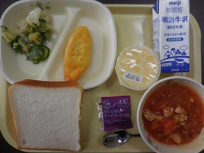 【給食メニュー】ご飯、牛乳、鶏の唐揚げ、もやしのナルム、キムチスープです。今日は「阿久津小6年2組リクエストメニュー」です。特に唐揚げではレモンソースで和えており、さっぱりとした味わいでした。ごちそうさまでした。