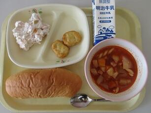 今日の給食は、セルフフルーツサンド(牛乳パン、フルーツクリーム)、牛乳、チキンナゲット、ミネストローネです。高根沢町で生産されたものは、にんじん、玉ねぎです。今日もたいへんおいしくいただきました。