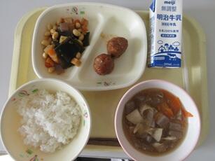 今日の給食は、ご飯、牛乳、野菜肉団子、五目煮豆、のっぺい汁です。高根沢町で生産されたものは、にんじん、まいたけ、米です。今日もたいへんおいしくいただきました。