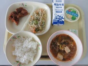今日の給食は、ご飯、牛乳、油淋鶏(ユーリンチー)、春雨サラダ、キムチスープ、シークワーサーゼリーです、高根沢町で生産されたものは、味噌、にんじん、ねぎ、キャベツ、玉ねぎ、米です。今日もたいへんおいしくいただきました。