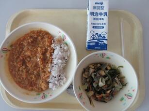 今日の給食は、黒紫米入りご飯、牛乳、大豆ミート入りひき肉カレー、こんにゃく海藻サラダです。高根沢町で生産されたものは、にんじん、キャベツ、玉ねぎ、黒紫米、米です。今日もたいへんおいしくいただきました。