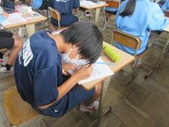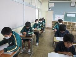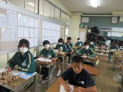 「話を聞いて質問しよう」の単元で、自己紹介を聞いて、ポイントをメモする授業が進められていました。