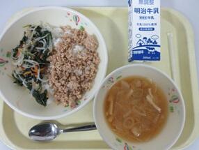 今日の給食は、地産地消ウィークで、二色丼(ご飯・大豆入り鶏そぼろ・ナムル)、牛乳、大根と油揚げの味噌汁です。高根沢町で生産されたものは、味噌、にんじん、ねぎ、大根、米です。今日もたいへんおいしく頂きました。