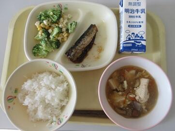 今日の給食は、ご飯、牛乳、いわしのおかか煮、ブロッコリーとチーズのサラダ、きのこけんちん汁です。高根沢町で生産されたものは、味噌、にんじん、なめこ、大根、ねぎ、まいたけ、米です。今日もたいへんおいしくいただきました。