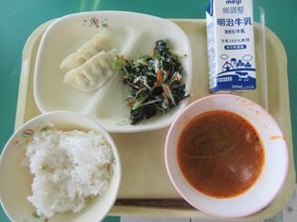 今日の給食は、ご飯、牛乳、焼き餃子、チョレギサラダ、キムチスープです。高根沢町で生産されたものは、豆腐、味噌、にんじん、ねぎ、玉ねぎ、米です。今日もたいへんおいしく頂きました。