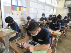 読み物資料「スマホに夢中」を使って、自分の今の生活を見直していました。(理科室で、道徳の授業を行っていました。)