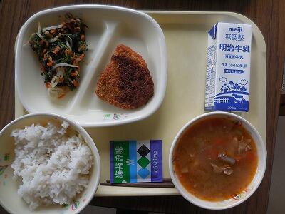 【給食メニュー】麦ご飯、牛乳、かぼちゃコロッケ、柚子鰹和え、豚汁、ふりかけです。今日は「冬至メニュー」「ん(運)」のつくものを食べて無病息災を願うようにと大根(だいこ)、人参(に)、南京(な)などの食材を多く使ったそうです。ごちそうさまでした。