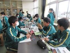 火成岩の種類による違いを押さえるために、教員が指示した火成岩を選ぶ活動が行われていました。