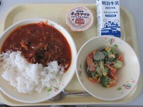 今日の給食は、ハヤシライス(ご飯、ハヤシルウ)、牛乳、コーンとブロッコリーのサラダ、チョコプリンです。高根沢町で生産されたものは、にんじん、玉ねぎ、まいたけ、米です。今日もたいへんおいしく頂きました。