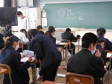 今日の様子(4/28)FG 2日目 投稿日時 : 2022/04/28 HP担当者 いよいよ明日からゴールデンウイークが始まります。企業によっては10日間の連休もあり、行楽地や帰省等で多くの人が出かけることが予測されます。各御家庭におかれましてはコロナ感染防止対策を徹底していただき、楽しい連休をお過ごしください。なお、連休明けには塩谷地区春季大会等も控えておりますのでよろしくお願いいたします。【耳鼻科検診】今日は全学年「耳鼻科検診」を行っています。今後、内科検診や歯科検診等、実施していきますのでよろしくお願いいたします。【授業の様子】1年1組「社会」 1年2組「国語」 1年3組「英語」 1年4組「社会」 2年1組「英語」 2年2組「英語」 2年3組「理科」 2年4組「国語」 2年5組「音楽」 2年6組「社会」 3年5・6組「数学」 3年5・6組「数学」 3年5・6組「数学」【給食メニュー】ご飯、牛乳、ハンバーグステーキ、ツナ海苔酢和え、大根と油揚げの味噌汁です。昔、ドイツのハンブルグ地域の人たちが、ひき肉と玉ねぎを混ぜて食べていた「ハンブルグステーキ」という料理が「ハンバーグステーキ」と呼ばれるようになったとのことです。今日も美味しくいただきました。ごちそうさまでした。