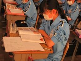 三単現の疑問文と否定文の構成を意識しながら問題を解く授業の前に、弾丸インプットに取り組んでいました。