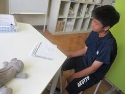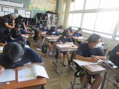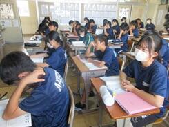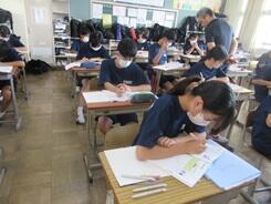 教材文「絶滅の意味」で、文章の構成を捉える授業の前に、聞き取りテストに取り組んでいました。