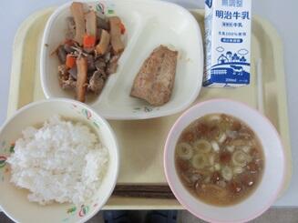 今日の給食は、ご飯、牛乳、さばのみぞれ煮、豚肉とごぼうの煮物、なめこ汁です。高根沢町で生産されたものは、味噌、なめこ、ねぎ、米です。今日もたいへんおいしく頂きました。