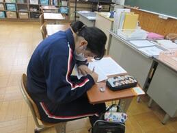 篆刻で、彫り、磨きから試し押しに進んでいる生徒もいました。