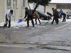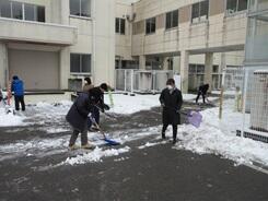本日、臨時休業ですが、明日の生徒たちの登校に備え、職員で、校門、自転車置き場、生徒たちの通路、そして給食車の通路の雪かきを行い、最後に融雪剤をまきました。先生方の力に感謝です。