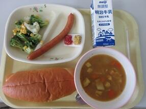 今日の給食は、セルフドックパン(牛乳パン、ウインナー、ケチャップ&マスタード)、牛乳、花野菜サラダ、マカロニカレースープです。高根沢町で生産されたものは、にんじん、玉ねぎ、アスパラガスです。今日もたいへんおいしく頂きました。