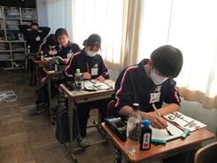 卒業記念作品の篆刻づくりが順調に進み、試しに押印している生徒もいました。
