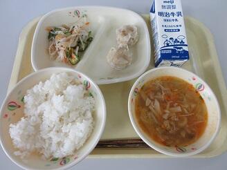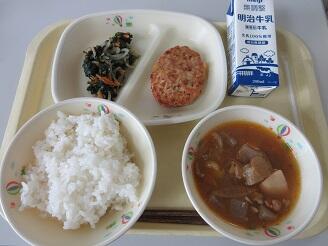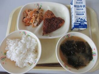 今日の給食は、ご飯、牛乳、ソースメンチカツ、切干大根とツナの和え物、豆腐とわかめの味噌汁です。高根沢町で生産されたものは、豆腐、味噌、ねぎ、玉ねぎ、米です。今日もたいへんおいしく頂きました。