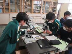 マツの花粉を、顕微鏡で観察していました。