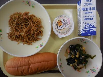 【給食メニュー】牛乳パン、牛乳、焼きそば、海藻サラダ、お米のババロア(豆乳みかん味)です。焼きそばをパンに挟んで「焼きそばぱん」で美味しくいただきました。ごちそうさまでした。