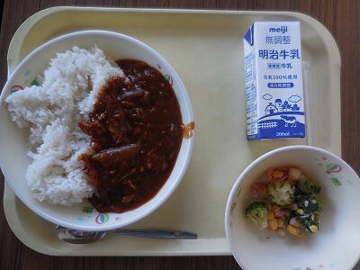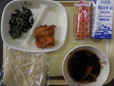 【給食メニュー】醤油ラーメン、牛乳、鶏の唐揚げ、ツナ海苔酢和え、原宿ドックです。今日のメニューは上高小6年生のリクエストメニューです。寒い日のラーメンは身体も心も温まりますね。ごちそうさまでした。
