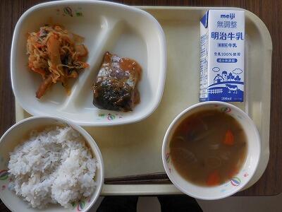 【給食メニュー】麦ご飯、牛乳、かぼちゃコロッケ、柚子鰹和え、豚汁、ふりかけです。今日は「冬至メニュー」で「ん(運)」のつくものを食べて無病息災を願うようにと大根(だいこん)、人参(にんじん)、南京(なんきん)などの食材を多く使ったそうです。ごちそうさまでした。