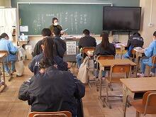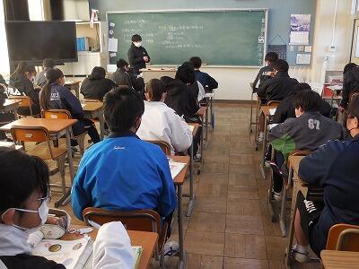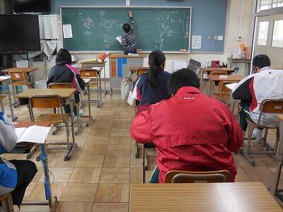 今日の様子(1/26) 投稿日時 : 2023/01/26 HP担当者 出勤時間帯の車外温度が氷点下11℃を示し、おもわずびっくりしてしまいました。多くの生徒が自転車を押して登校する姿が目立ちました。このような状況での対応(危機回避能力)を学んだことでしょう。 さて、明日は「立志式」を予定どおり実施いたします。なお、係りや発表者等の生徒は事前リハーサルがありますので集合時刻が早まりますので御了承ください。【授業の様子】1年1組「数学」 1年2組「英語」 1年3組「社会」 1年5組「保健体育」 1年4組「保健体育」2年1組「音楽」 2年2組「国語」 2年3組「家庭」 2年4組「技術」 2年5組「英語」 2年6組「理科」 3年1組「国語」 3年2組「理科」 3年3・4組「数学」 3年3・4組「数学」 3年3・4組「数学」 3年3・4組「数学」 3年5組「国語」 3年6組「社会」 【給食メニュー】牛丼、牛乳、干ぴょう入りかき卵汁、お祝いデザート(ガトーショコラ)です。牛肉がとても柔らかく、味付けも最高でした。貧血や肌をきれいに保つ成分が多く含まれているそうです。今日も美味しくいただきました。