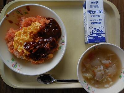 【給食メニュー】チキンオムライス、牛乳、ポトフです。卵の値段が高騰している中、たくさんの卵を使用してのメニューに感謝いたします。とろとろのスクランブルエッグがとても美味しかったです。ごちそうさまでした。