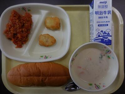 【給食メニュー】牛乳パン、牛乳、チキンナゲット、スラッピージョー、クラムチャウダーです。「ナゲット」は英語で「金の塊」という意味で、こんがりと黄金色に揚がった様子から名付けられたそうです。今日も美味しくいただきました。