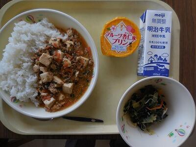 【給食メニュー】マーボー丼、牛乳、チョレギサラダ、フルーツ杏仁です。「チョレギ」とは韓国語で浅漬けのキムチを意味するそうです。給食は誰もが食べやすいように辛さを控えめに作られています。給食も残り1回となりました。今日も美味しくいただきました。ごちそうさまでした。