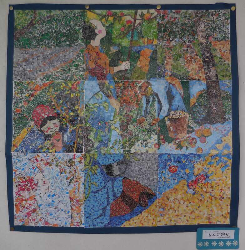 8・9組の美術の作品「ちぎり絵」です。広告の色紙などを細かくちぎって完成させました。見事な作品です。