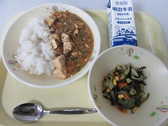 今日の給食は、ご飯、牛乳、チキンカレー、ブロッコリーとしめじのサラダです。高根沢町で生産されたものは、玉ねぎ、米です。今日もたいへんおいしく頂きました。