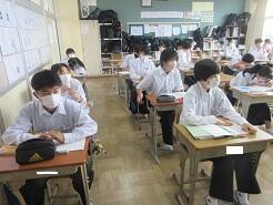 校歌の歌唱のテストを練習室でやっていたので入れませんでした。テストを受けている生徒以外はワークに取り組んでいました。
