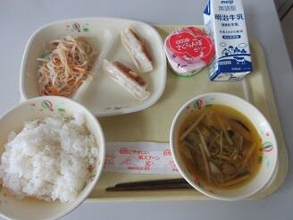 今日の給食は、ご飯、牛乳、焼き餃子、春雨サラダ、茎わかめの中華スープ、さくらんぼゼリーです。高根沢町で生産されたものは、にんじん、しいたけ、きゅうり、キャベツ、米です。今日もたいへんおいしく頂きました。