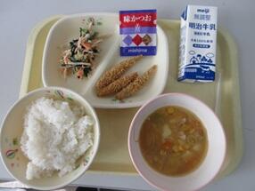 今日の給食は、かみかみメニューで、ご飯、牛乳、きびなごフライ、ごぼうサラダ、どさんこ汁、ふりかけ(味かつお)です。高根沢町で生産されたものは、味噌、にんじん、ねぎ、米です。今日もたいへんおいしく頂きました。