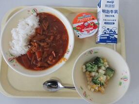 今日の給食は、食パン、牛乳、キーマカレー、アンサンブルエッグ、フルーツヨーグルトです。高根沢町で生産されたものは、にんじん、玉ねぎです。今日もたいへんおいしく頂きました。