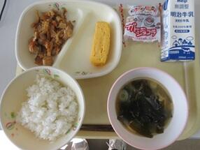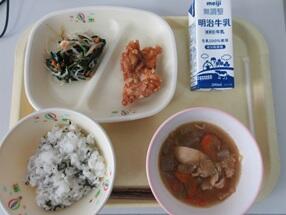 今日の給食は、阿久津中1年1組の献立で、わかめご飯、牛乳、鶏から揚げのレモンソース和え、もやしのナムル、豚汁です。高根沢町で生産されたものは、味噌、にんじん、ねぎ、米です。今日もたいへんおいしく頂きました。