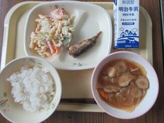今日の給食は、ご飯、牛乳、さんまかぼすレモン煮、根菜のごま汁です。高根沢町で生産されたものは、味噌、にんじん、キャベツ、ねぎ、きゅうり、米です。今日もたいへんおいしく頂きました。