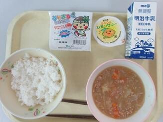 今日の給食は、ご飯、牛乳、冷やっこ、じゃが芋のそぼろ煮、レモンゼリーです。高根沢町で生産されたものは、玉ねぎ、米です。今日もたいへんおいしく頂きました。
