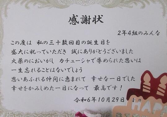 ちょっといい話106のつづきです。今日の朝、教室を見て歩いていると、昨日黒板に誕生日お祝いメッセージが書かれていた2年4組の黒板に、担任からクラスへの感謝状が貼ってありました。担任とクラスの生徒たちの信頼関係が築けているよいクラスだな、と思ってうれしくなりました。