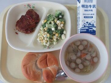 今日の給食は、米粉パン、牛乳、かぼちゃ型ハンバーグデミソースがけ、ブロッコリーとチーズのサラダ、野菜とウインナーのスープです。高根沢町で生産されたものは、玉ねぎ、米粉パンです。今日もたいへんおいしくいただきました。